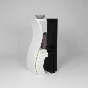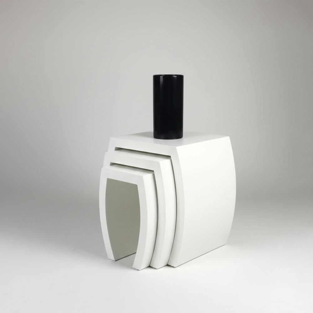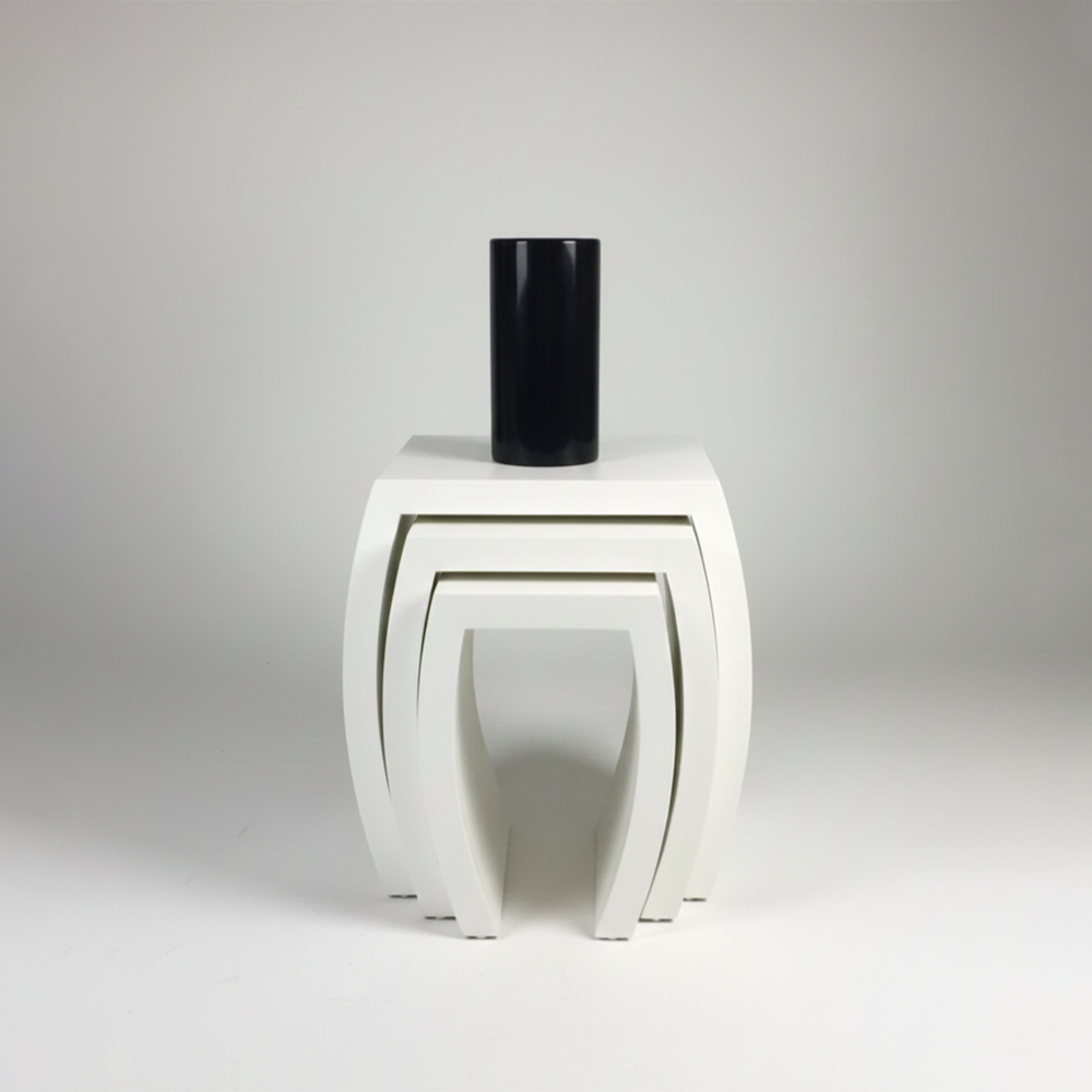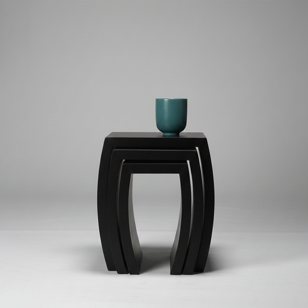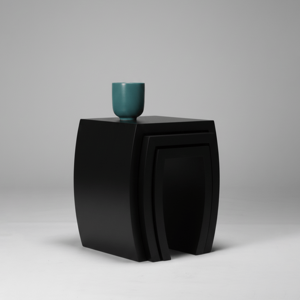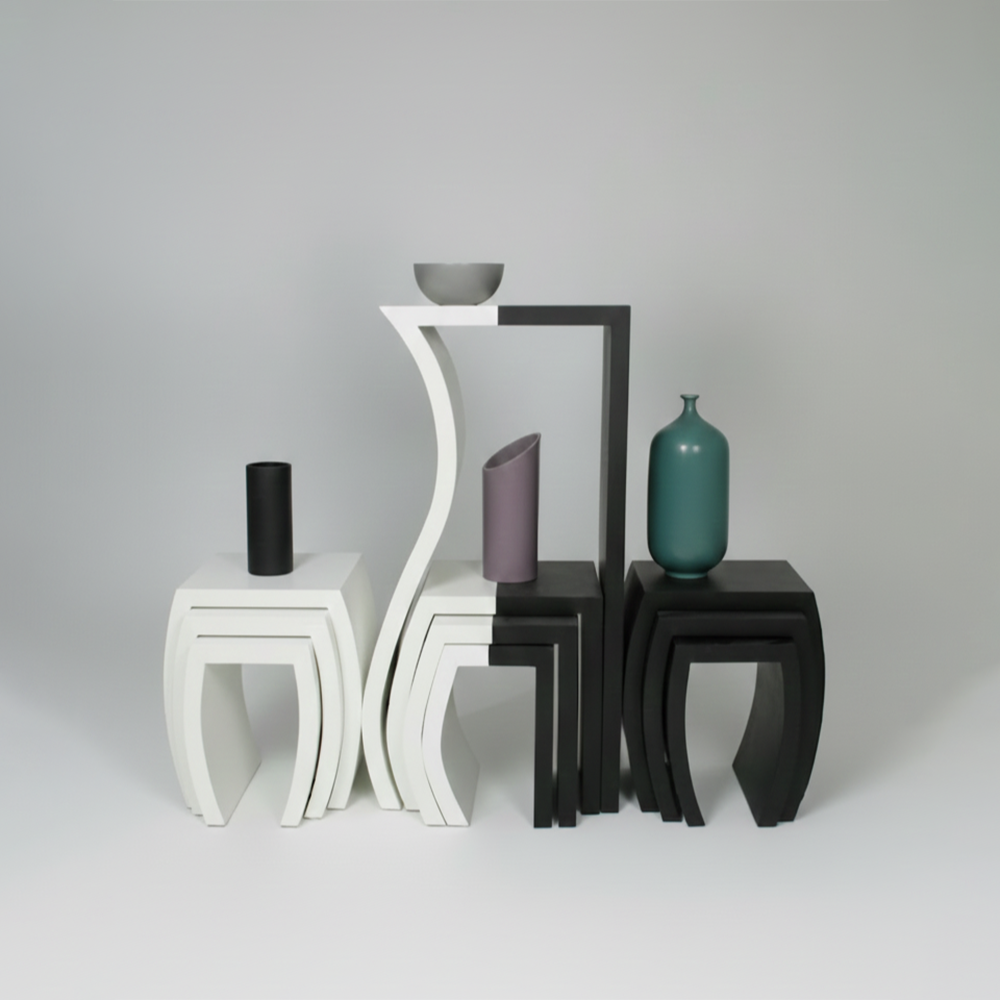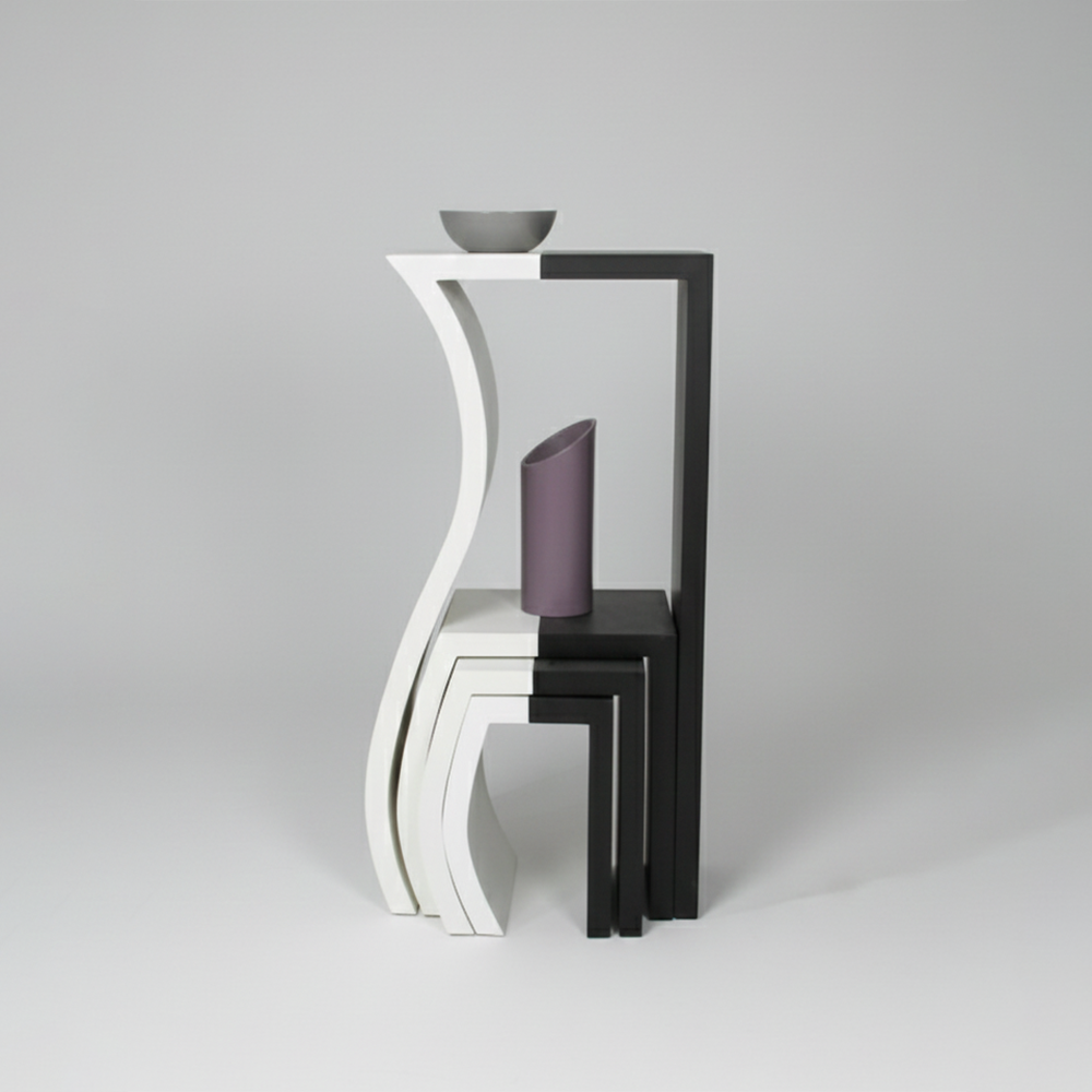 A sculptural study in duality and spatial efficiency, these tables feature organic, fluid curves that allow them to function as a cohesive art installation or as individual functional tiers.