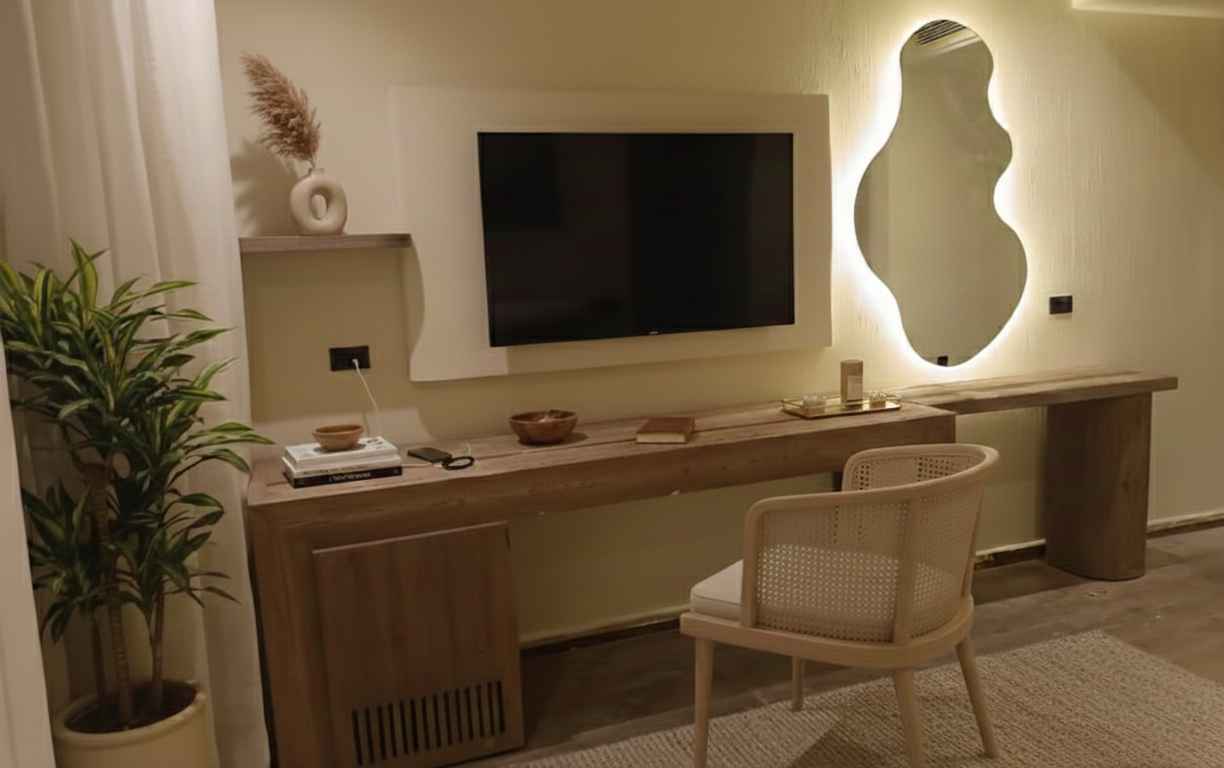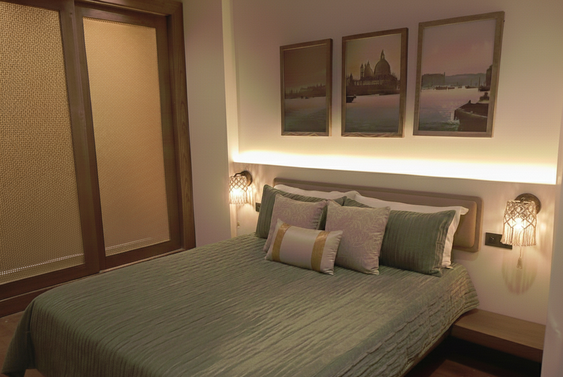 A contemporary wooden bed featuring a soft upholstered headboard and integrated warm LED backlighting, designed to create a cozy and refined bedroom atmosphere.